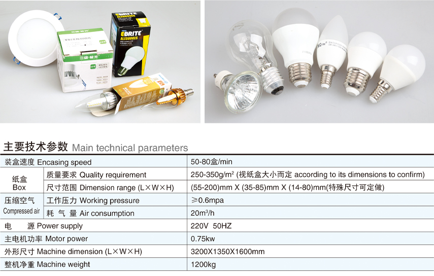 本產(chǎn)品是我公司結(jié)合國外包裝機的先進技術(shù)及根據(jù)目前照明、電子等行業(yè)的實際情況而研發(fā)的具有新型、先進的包裝機械設(shè)備,是機、電、氣、光- -體化的高科技產(chǎn)品。本產(chǎn)品適用于照明、電子等行業(yè)各類球泡燈、蠟燭(尾)燈、筒燈、射燈、單端熒光燈、節(jié)能燈、鎮(zhèn)流器等等以及相類似物品的裝盒包裝。具有將紙盒自動打開、物品裝盒、封盒等功能;同時也是解決目前招工難、管理難而代替勞動力的先進自動包裝設(shè)備。該機可以單獨使用亦可以與其他設(shè)備聯(lián)動使用,形成成套生產(chǎn)聯(lián)動線。