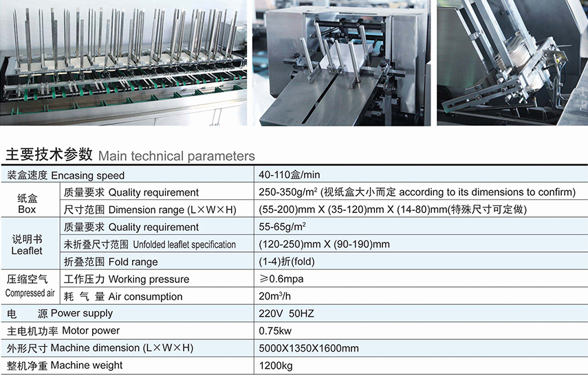 本產品是我公司結合國外裝盒機的先進技術及根據國內制藥行業的實際情況而研發的擁有新型、具有先進的多功能自動裝盒機,是機、電、氣、光一體化的高科技產品。本產品適用于制藥廠的膏藥片、面膜、四邊封的顆粒粉裝袋,三邊封的顆粒粉裝二連袋以及相類似物品的裝盒包裝,該機具有自動完成使用說明書的折疊、紙盒自動打開、物品帶說明書裝盒,打印批號、封盒等功能。該機可以單獨使用亦可以與其他設備聯動使用,形成聯動生產線。